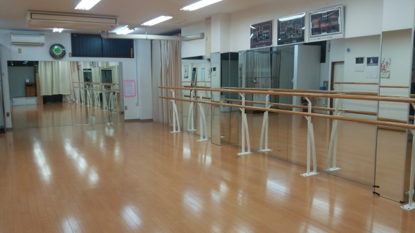 2面鏡・2段式固定バー・バレエ専用床・更衣室・トイレ・冷暖房完備